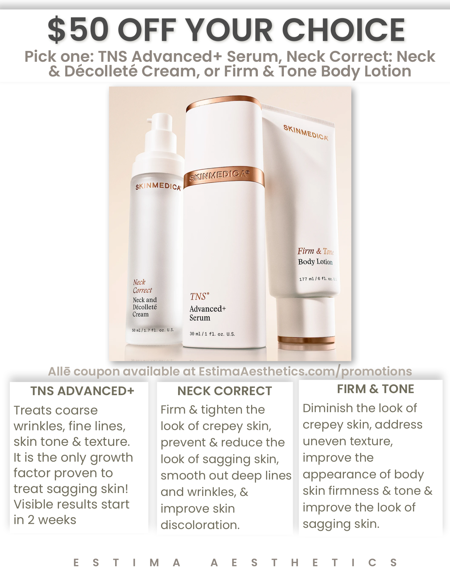 Don’t neglect the rest of your skin! With SkinMedica’s revolutionary body products: Neck Correct & Firm & Tone Lotion you will be confident in no time. Improve crepey, sagging skin and treat cellulite!